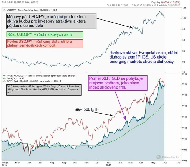 Následující graf ukazuje poměr XLF a zlata (GLD). XLF je certifikát složený z nejvýznamnějších amerických bank. Poměr těchto dvou aktiv v uplynulých měsících v podstatě kopíruje vývoj akciového indexu S&P 500. Poměr XLF/GLD je navíc téměř totožný se směrem vývoje měnového páru USD/JPY. Silný dolar proti jenu znamená silné akcie obecně, zejména ty finanční, a znamená slabé zlato a další komodity.