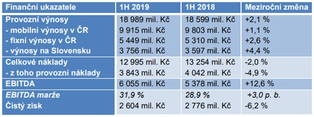 Výnosy ve fixní síti vzrostly o 2,6 % na 5,45 miliardy Kč, mobilní výnosy pak stouply o procento na 9,92 miliardy Kč. Výnosy slovenské dceřiné společnosti O2 Slovakia vzrostly o 4,4 % na 3,76 miliardy Kč. EBITDA zisk společnosti vzrostl o 12,6 % na 6,06 miliardy Kč a EBITDA marže v prvním pololetí dosáhla 31,9 %, meziročně tak byla vyšší o tři procentní body.