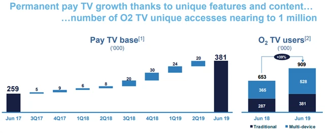 Vysokorychlostní internet O2 na konci června využívalo asi 822 000 zákazníků, meziročně o 20 000 více. Počet zákazníků televize O2 TV, včetně uživatelů měsíčních balíčků a těch, kteří sledují televizi na webu či v aplikaci, se meziročně zvýšil o 39 % na 909 000 aktivních přístupů.