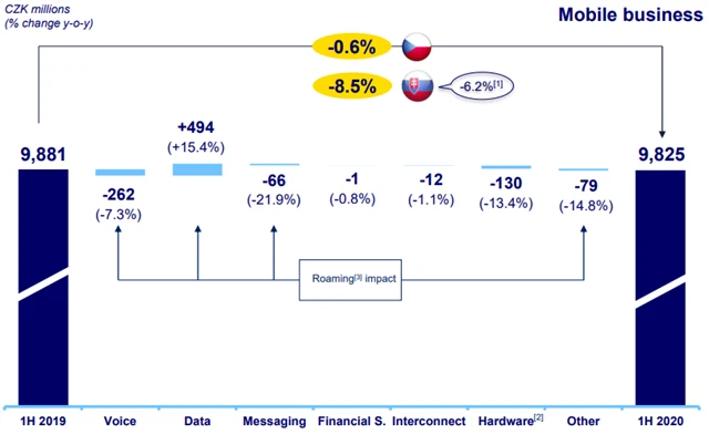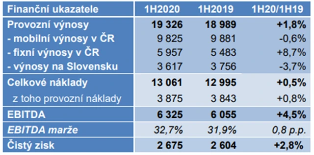 Výnosy v mobilním segmentu klesly v prvním pololetí o 0,6 % na 9,83 miliardy Kč, výnosy ve fixním segmentu se naopak zvýšily o 8,7 % na 5,96 miliardy Kč.