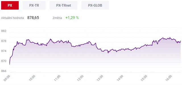 Pražská burza v úvodu týdne posílila. Index PX v pondělí stoupl o 1,29 % na 878,65 bodu. Dařilo se většině hlavních titulů v čele s akciemi výrobce cigaret Philip Morris ČR.
