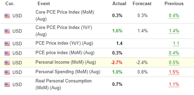 Jádrový cenový index osobní spotřeby (oblíbený inflační ukazatel Fedu, takzvaná PCE inflace) meziročně vzrostl o 1,6 % (odhad: +1,4 %). Osobní spotřeba meziměsíčně vzrostla o procento (odhad: +0,8 %), nečekaně výrazně ale klesly příjmy Američanů, konkrétně o 2,7 % (odhad: -2,4 %).