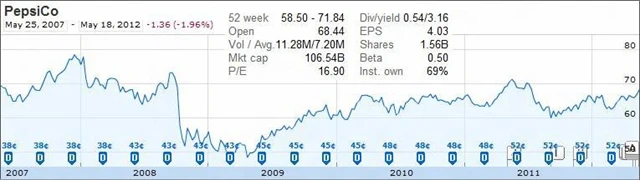 Společnost PepsiCo již několik let v řadě pravidelně každoročně navyšuje vyplácené dividendy. Výjimkou není ani rok 2012, ve kterém by se dividenda měla zvýšit o 4 % na 2,15 dolaru na akcii. Dividendový výnos je v současnosti přes 3 %.