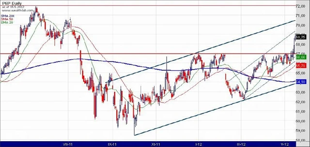 Aktuálně se cena akcií společnosti PepsiCo pohybuje okolo 68 dolarů. Došlo k proražení střednědobé rezistence na úrovni kolem 67 dolarů. Na základě technické a fundamentální analýzy jsme dospěli k názoru, že je na současných úrovních vhodné akcie společnosti nakoupit. V nejbližších týdnech by měla být otestována rezistence na úrovni 72 dolarů. V případě jejího proražení očekáváme v následujících 6 až 12 měsících růst ceny až k úrovni kolem 75 až 80 dolarů.
