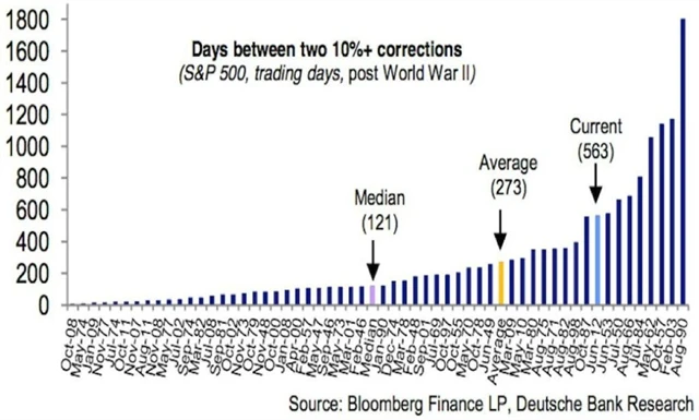 Podle Deutsche Bank jsou podobně dlouhé periody akciového růstu celkem typické pro růstovou fázi cyklu ekonomiky mimo recesi. 10% a hlubší poklesy se naopak vyskytují zpravidla před obdobími nebo v dobách recese a krize. Vzhledem ke zhruba 4% růstu americké ekonomiky si tak na hlubší pokles, navzdory geopolitickým rizikům a možnému zpřísnění měnové politiky Fedu, ještě můžeme počkat delší dobu.