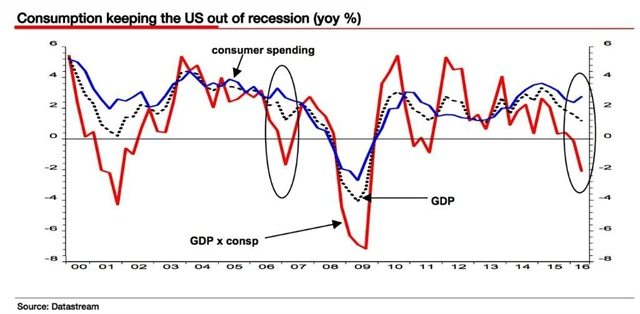 Současnou situaci v americké ekonomice porovnává s rokem 2007, kdy spotřeba jako jediná držela HDP v plusu. Nakonec ale klesající firemní investice a zpomalení na trhu práce dolehly i na spotřebitele a domácí produkt začal klesat.