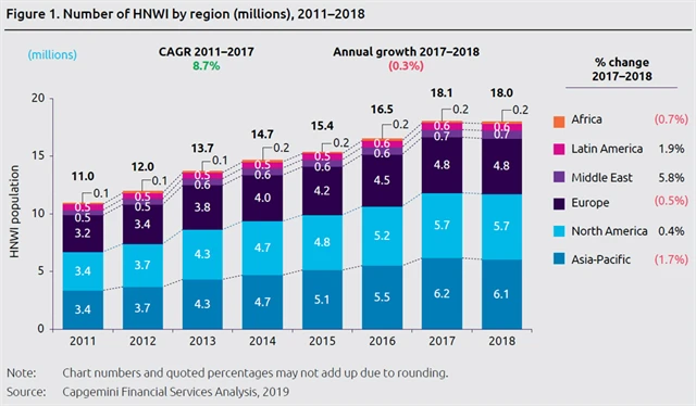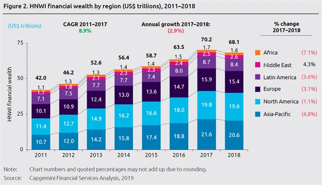 Po sedmi letech růstu majetku lidí označovaných jako high net worth individuals (HNWI, lidé s investovatelným majetkem alespoň milion dolarů) došlo v roce 2018 k poklesu, a to o 2,9 %, tedy asi 2 biliony dolarů. Převážně to bylo kvůli propadu na trzích v regionu Asie a Pacifiku.