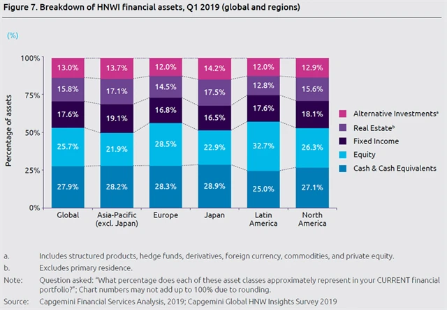Peníze a peněžní ekvivalenty nově tvoří největší podíl na majetku dolarových milionářů (28 %, o rok dříve 27 %). Předběhly dříve dominantní investice do vlastního kapitálu veřejně obchodovatelných společností, které nyní tvoří 26 % portfolií milionářů (o rok dříve 31 %). Snížení podílu investic do vlastního kapitálu společností je způsobeno zejména zvyšující se volatilitou na akciových trzích, kdy investoři (primárně z Asie a Pacifiku) stále více investují do alternativních investičních produktů (strukturované investice, hedgeové fondy, deriváty, forex, komodity a investice do vlastního kapitálu soukromých společností). Podíl alternativních investic na majetku dolarových milionářů meziročně vzrostl o čtyři procentní body na 13 %, přičemž převládaly investice do startupů a rychle rostoucích malých firem.