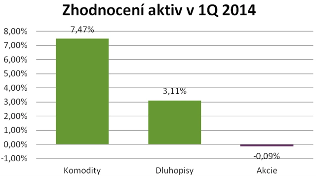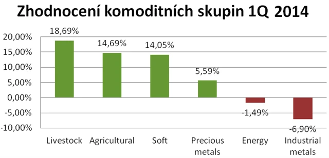 Úvodní čtvrtina roku 2014 byla pro komoditní investory úspěšná. Komodity dosáhly po delší době vysokého zhodnocení a jako celek přidaly téměř 8 %. S přehledem porazily ostatní skupiny investičních aktiv, když globální státní dluhopisy zhodnotily za stejnou dobu o 3 % a akciové indexy mírně ztratily.