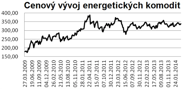 Ceny ropy a plynu již delší dobu stagnují v poměrně úzkém pásmu s resistencí na 350 bodech. Budoucí vývoj tak bude podle našeho názoru do velké míry závislý na napětí mezi Ruskem a Ukrajinou. Při zhoršení současného stavu a při případné ruské vojenské zaangažovanosti i v dalších regionech východní Ukrajiny je možné počítat s růstem jejich hodnoty.
