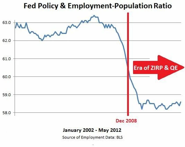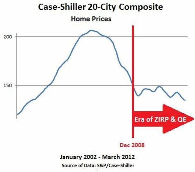 Jak ovšem ukazují grafy americké zaměstnanosti (podíl lidí starší 16 let, kteří mají práci) a indexu cen amerických domů (S&P/Case-Shiller), opatření Fedu v těchto dvou zásadních směrech pro vývoj celé americké ekonomiky nezmohla prakticky nic.