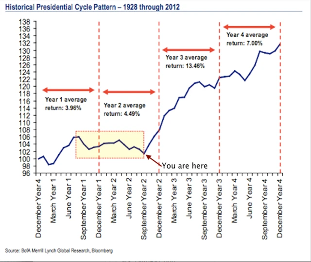 Následující graf znázorňuje volební roky v polovině mandátu od roku 1982. Žluté zvýraznění značí období od října do prosince. Šipka znázorňuje minimum před začátkem 4. čtvrtletí.
