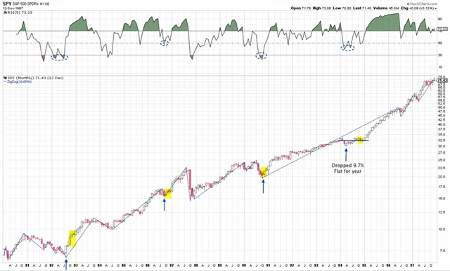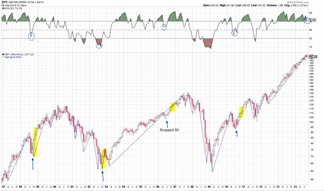 Index S&P 500 klesal minimálně o 10 % před 4. čtvrtletím každého volebního roku v polovině mandátu. Měsíční RSI (index relativní síly) spadl pod 50 (horní část grafu). Nejmenší pokles byl zaznamenán v roce 1994. Tento rok skončil stagnací a odmazáním zářijových zisků v listopadu a prosinci.