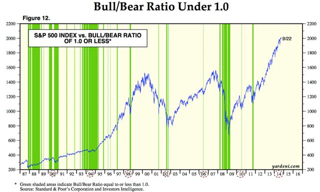 Je patrné, že v každém z těchto roků se sentiment investorů měnil směrem k pesimismu (označeno kroužky). Platilo to dokonce i v těch nejlepších letech (2006 i 1994).
