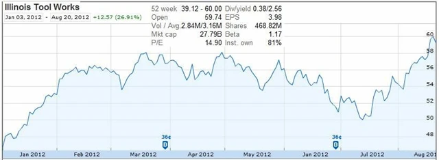 Společnost má za sebou hvězdný vstup do roku 2012, od začátku roku přidaly akcie průmyslového gigantu téměř 27 %. Illinois Tool Works vlastní 800 poboček v 58 zemích, diverzifikovanou skupinu divizí, které se zabývají vším od potravinářského průmyslu přes autodíly až po komerční výstavbu. Investoři mohou očekávat solidní výkon po celý zbytek roku.