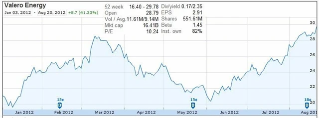 Akcie nezávislé rafinérské společnosti Valero se v letošním roce vyznačují výborným výkonem, když posílily o 4O %. 14 rafinérií je schopno zpracovat každý den více než 2,8 milionu barelů ropy a firma vlastní obrovský etanolový byznys a řetězec benzínek. Valero je sice integrovaná ropná společnost bez nejziskovější těžební a produkční divize, ale přesto dokáže dlouhodobě udržovat vysoké marže. Lepší rafinérskou strukturu byste u konkurence nenašli. Firma díky tomu generuje také dostatek hotovosti k navyšování dividendy.