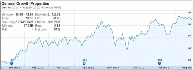 Komerční REIT (realitní investiční společnost - real estate investment trust) General Growth Properties působí ve 170 regionálních obchodních centrech napříč Spojenými státy. Jako klasický REIT dlouhodobě pronajímá komerční prostory. Poté, co se "otřepala" z bankrotu v roce 2009, zlepšila své nemovitostní portfolio a začala investory znovu příjemně překvapovat. I když má General Growth Properties před sebou ještě stále několik nevyřešených otázek, jde o úplně jinou firmu než před krizí z let 2007 až 2008. Společnost se zavázala k výplatě valné většiny svého zisku investorům ve formě dividend.