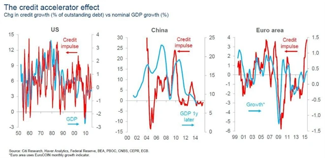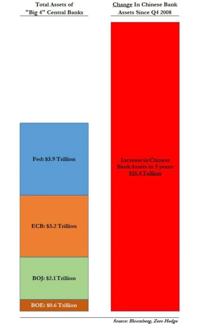 Tempo, jakým Čína přistoupila k vytváření dluhu v posledních letech, je v porovnání s ostatními centrálními bankami nedostižné. Za pět let od vypuknutí finanční krize vytvořila Čínská lidová banka bankovní úvěry v objemu 15 bilionů dolarů. To zemi vytvořilo zdánlivý globální úvěrový polštář, který ji ochránil před recesí v západních ekonomikách a výrazně zastínil snahu čtyř největších centrálních bank v rozvinutých zemích.