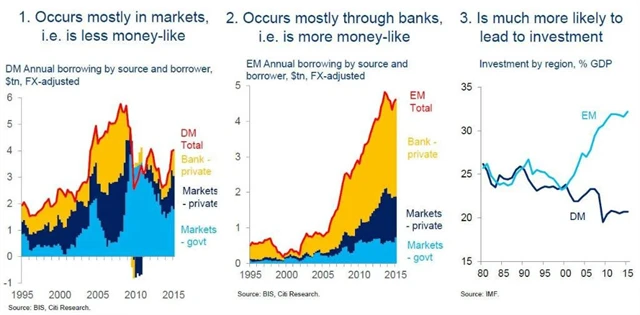 V rozvíjejících se ekonomikách tomu bylo jinak, protože zde fungoval klasický postup s bankou jako prostředníkem při poskytování úvěru do reálné ekonomiky. Vedlejšími efekty byly akumulace devizových rezerv a posílení měnové báze. Důležité je, že nové peníze vedly k růstu investic, i když kvůli tomu docházelo k takovým nesmyslům, jako byly výstavba měst duchů a nevídané hromadění komodit. Problémem je rovněž skutečnost, že vzniká nebezpečná kreditní bublina, protože dluhy se hromadí ve firemních rozvahách.