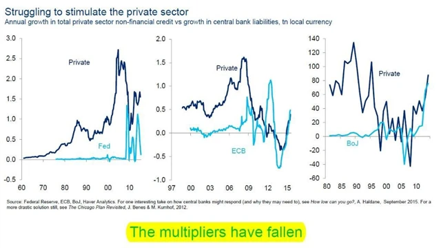 Proč je tak důležité vědět, kde se tvoří více dluhů? Vysvětlení spočívá v tom, kam šly nově vytvořené peníze. V západních ekonomikách se peníze vytvořené centrálními bankami nedostávaly na trh, do peněžního systému (zčásti i proto, že o úvěry nebyl velký zájem), ale zůstávaly na finančních trzích, čímž docházelo k růstu cen finančních aktiv. Málo peněz v ekonomice vede k nižším investicím a chybějícímu multiplikačnímu efektu.
