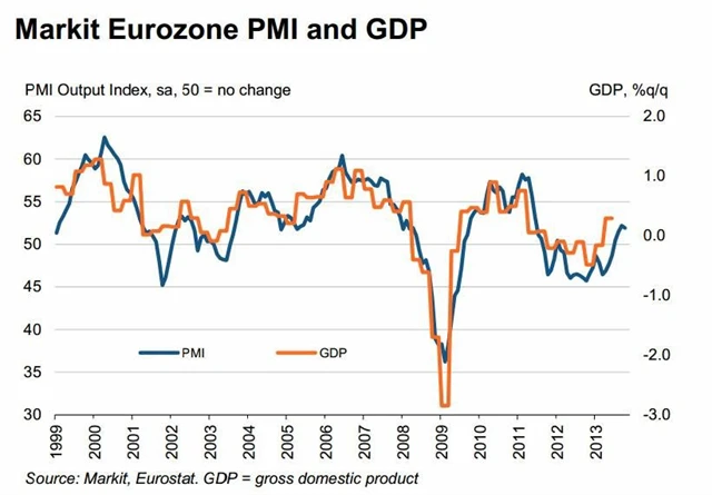 Oživení zpracovatelského sektoru v eurozóně zůstává křehké a skromné. Index nákupních manažerů za říjen vzrostl v souladu s předběžnými odhady na 51,3 bodu ze zářijových 51,1 bodu. Index nákupních manažerů ve službách v říjnu klesl na 51,6 bodu z 52,2 bodu v září. Čekal se pokles až na 50,9 bodu. Kompozitní index PMI pro eurozónu klesá ze zářijových 52,2 bodu na 51,9 bodu. Přesto jde o expanzi, která trvá již čtvrtý měsíc v řadě.