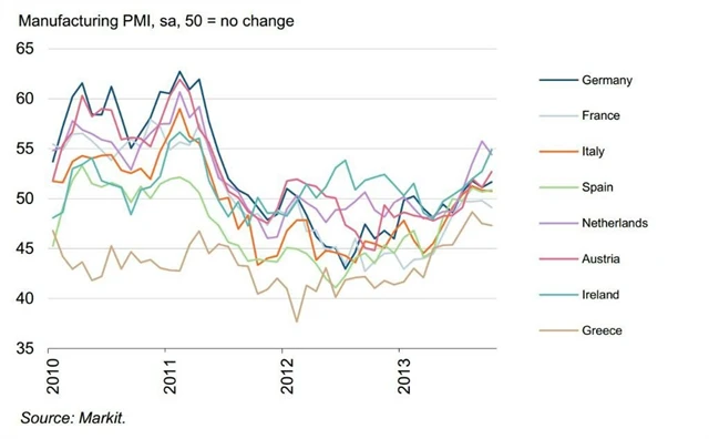 Zpracovatelský sektor v Irsku vyskočil na 30měsíční maximum 54,9 bodu, Rakousko se dostalo na 28měsíční maximum 52,7 bodu a Španělsko a Německo vykázaly nejlepší výsledky za poslední 2 měsíce (50,9 bodu a 51,7 bodu v Německu). Na dvouměsíční minimum naopak spadlo Nizozemsko (54,4 bodu), tříměsíčního dna se dotkla Itálie (50,7 bodu) a Řecko (47,3 bodu) a Francie, která ani nesplnila předběžné odhady, vykázala jen mírné zlepšení na 49,1 bodu, což představuje čtyřměsíční minimum.