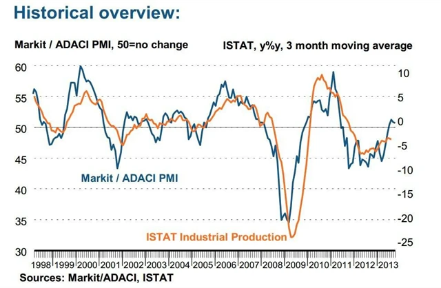Zpracovatelský sektor v Itálii v říjnu expandoval mírnějším tempem než v září - finální index PMI dosáhl 50,7 bodu ze zářijových 50,8 bodu. Index podporoval solidní růst produkce sektoru a mírně vzrostly i nové zakázky. Index nákupních manažerů ve službách v říjnu klesl na 50,5 bodu z 52,7 bodu v září. Čekal se přitom pokles jen na 51,2 bodu.