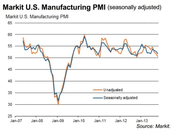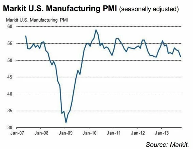 Americký výrobní sektor rostl v říjnu podle předběžných údajů společnosti Markit nejpomaleji za poslední rok. Index PMI klesl na 51,1 bodu ze zářijových 52,8 bodu.