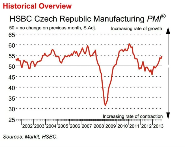 Podmínky ve zpracovatelském sektoru České republiky se v říjnu dále zlepšovaly. Produkce expandovala nejrychlejším tempem za dva a půl roku tažená novými zakázkami. Početní stavy firem se navíc nejrychleji od září 2011. Index nákupních manažerů je již šestý měsíc nad padesátibodovou hranicí. Ačkoliv v září mírně klesl na 53,4 bodu, v říjnu vyskočil na 54,5 bodu v nejsilnější expanzi od června 2011. Třetí měsíc v řadě všech pět komponentů indexu vykázalo zlepšení.