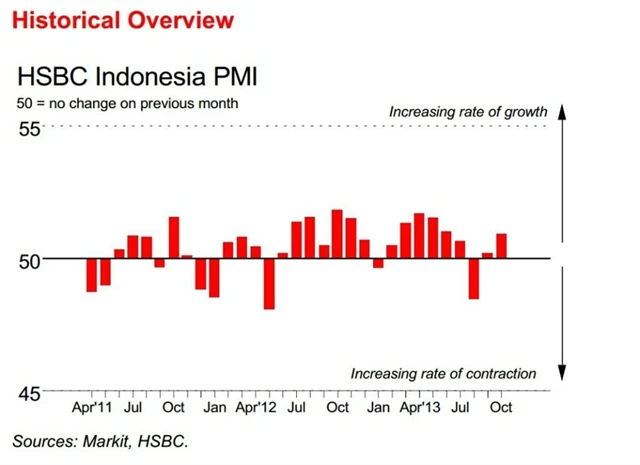 Indonéský zpracovatelský sektor se v říjnu dostal na čtyřměsíční maximum 50,9 bodu ze zářijových 50,2 bodu. Expanzi podpořil především růst produkce a nových zakázek.