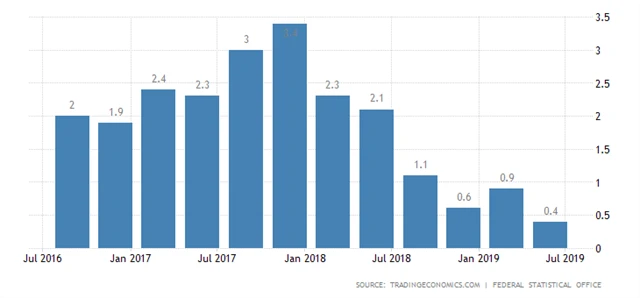 Déle než rok německá průmyslová výroba zaznamenává meziroční poklesy a jako celek vykáže zřejmě největší evropská ekonomika za třetí čtvrtletí recesi. Celoroční růst německé ekonomiky odhadujeme na pouhých 0,5 %, vyhlídky pro rok 2020 nejsou o mnoho lepší.