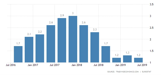 Eurozóna jako celek je na tom o něco lépe, i když růst v blízkosti jednoho procenta není žádný zázrak. Zpomalování růstu je realita, recesi v eurozóně ale nepředpokládáme. Do boje za její odvrácení se pustila i Evropská centrální banka, která uvolňuje měnovou politiku.