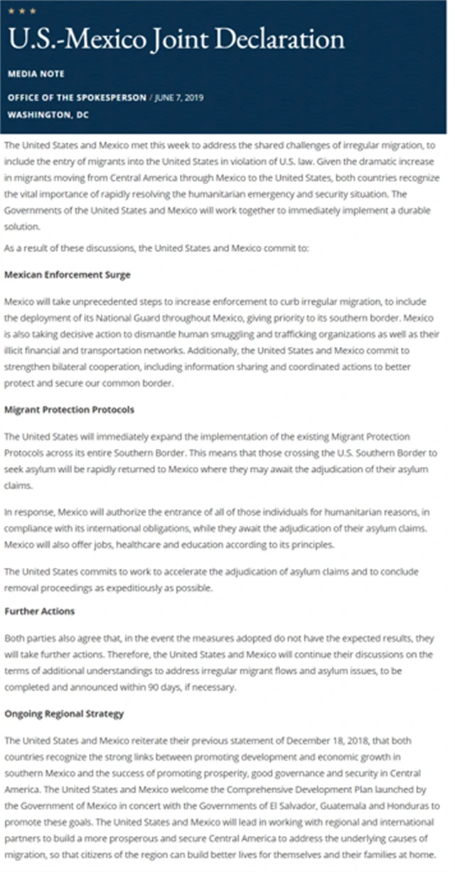 Pohraniční stráž USA zadržela v květnu více než 132 tisíc lidí, kteří se snažili dostat do Spojených států z Mexika. To byl nejvyšší měsíční počet od roku 2006. Trump označil příliv migrantů za invazi a pohrozil, že pokud Mexiko nezasáhne, může cla zvýšit až na 25 %. Mexiko slíbilo, že vyšle na hranici s Guatemalou 6 tisíc příslušníků národní gardy s cílem zastavit migranty mířící do USA. Zároveň uvedlo, že chce vidět dlouhodobé řešení, které bude zahrnovat hospodářkou rozvojovou pomoc.