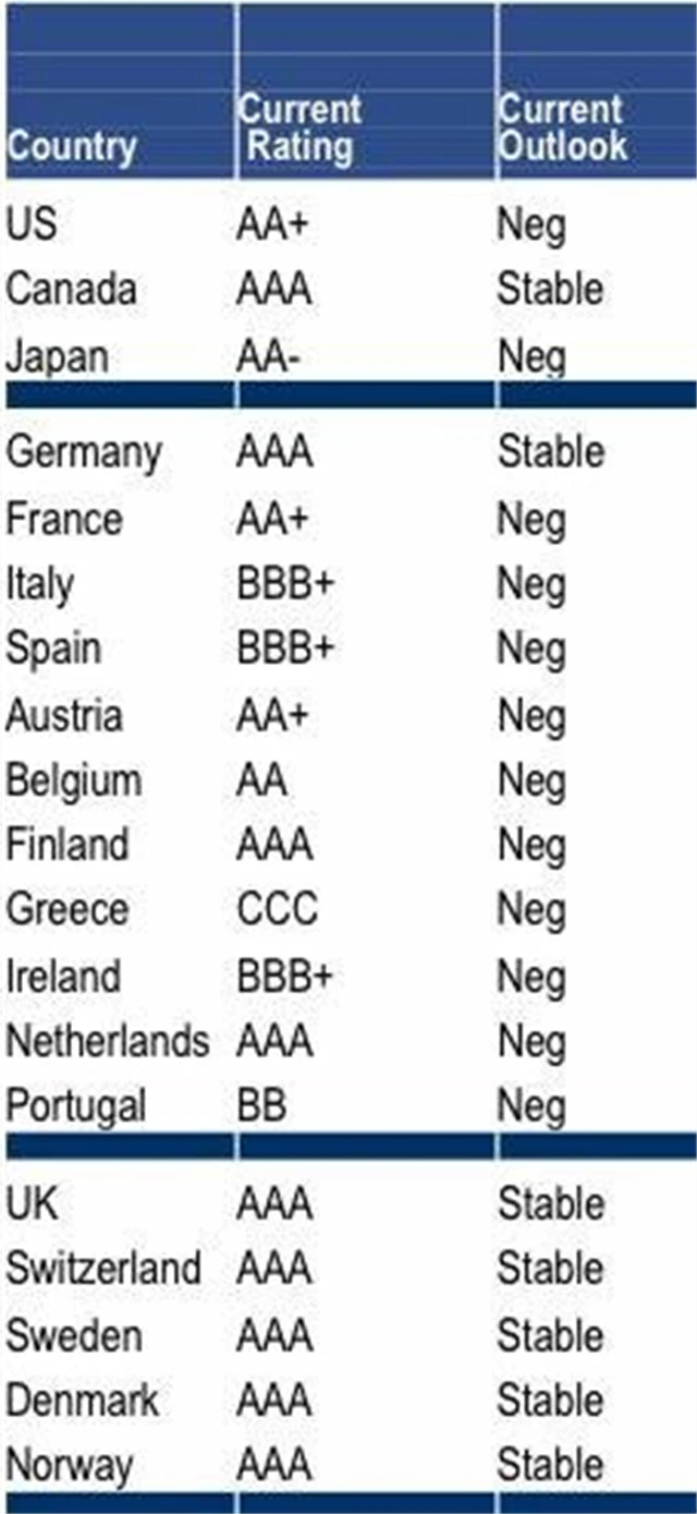 Před rokem se finanční trh přesvědčil, že na světě není země, jejíž rating má zajištěnou nejvyšší úroveň AAA. Podle analytiků Citigroup bude úbytek zemí s nejvyšším hodnocením schopnosti splácet své dluhy stále klesat. Dlouhodobě to podle Citigroup bude pouze Kanada a skandinávské země. V případě USA očekává americká banka další downgrade v horizontu dvou až tří let, podobný tlak čeká také na snížení hodnocení Japonska.