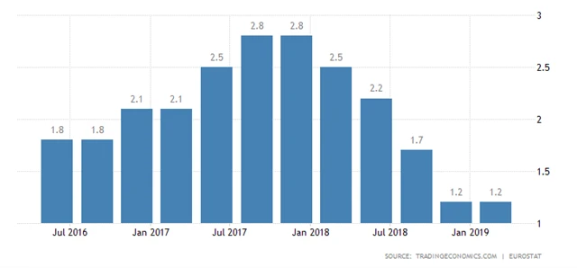 Snížili jsme prognózu inflace a růstu HDP v eurozóně pro rok 2019 na +1,2 %, respektive +1,1 %, aby odrážela nižší ceny ropy a slabší ekonomickou aktivitu v 2Q2019. V druhé polovině roku 2020 ale očekáváme mírné zlepšení domácí poptávky, které by mělo vést k oživení růstu HDP na +1,3 % v roce 2020.