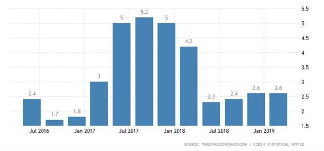 Prognózu globálního růstu jsme v červnu ponechali beze změny na úrovni +2,9 % pro rok 2019, ale snížili jsme ji na 2,8 % pro rok 2020 (-0,1 procentního bodu). Snížili jsme také výhled globálního růstu spotřebitelských cen na +2,4 % pro rok 2019 (-0,1 procentního bodu) i pro rok 2020 (-0,1 procentního bodu).