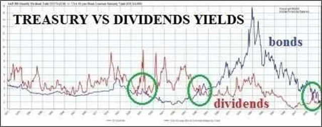 Uvedený graf nedávno na CNBC prezentoval Gary Kaminsky z Neuberger Berman. Graf představuje 140 let finanční historie Spojených států a porovnává dividendový výnos akcií s výnosem vládních obligací. Poslední roky, kdy se v tomto století výnosy potkaly, byl 1928 až 1930 a 1951.