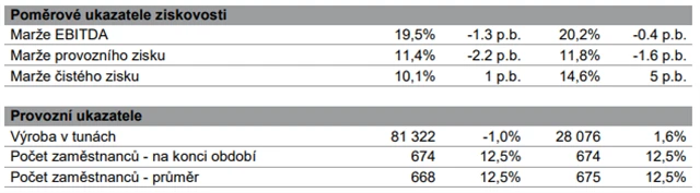 Provozní zisk EBITDA dosáhl za prvních devět měsíců roku 940,6 milionu Kč, meziročně o 5,9 % méně. Příčinou meziročního poklesu byl především slabý výsledek za druhé čtvrtletí způsobený nižším objemem výroby, jenž souvisel s velmi nízkou úrovní skladových zásob hotových výrobků, což neumožňovalo efektivní výrobu. Dopad mechanismu přenesení cen vstupních materiálů byl neutrální. Provozní výsledek EBIT dosáhl za první tři čtvrtletí roku 549,5 milionu Kč, o 15,7 % méně než ve stejném období loňského roku.