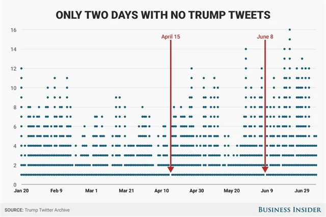 Donald Trump od své inaugurace 20. ledna do 7. července zveřejnil 920 tweetů. Denně se tak o své myšlenky a názory dělil v průměru 5,4krát. Aktivní nebyl jen dvakrát, a to 15. dubna a 8. června. Nejaktivnější byl Trump 22. června, kdy napsal 16 tweetů.