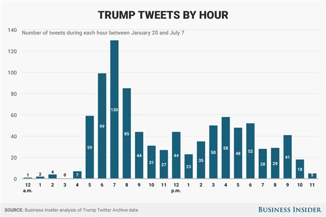 Jedna z prvních věcí, kterou ráno Trump dělá, je podle všeho to, že vezme do ruky telefon a pochlubí se, co se mu během noci urodilo v hlavě. Z 920 tweetů, které Trump ve zmíněném období napsal, jich 130 odeslal mezi sedmou a osmou hodinou ráno.