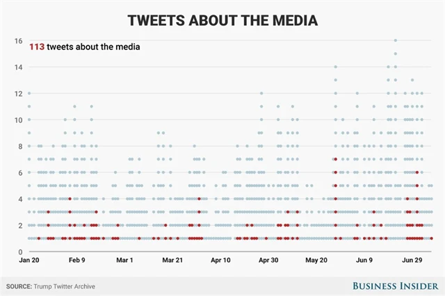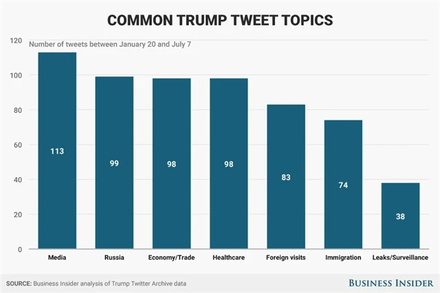 Tématem, ke kterému se americký prezident rád vyjadřuje, jsou média. Celkem v daném období odeslal 113 tweetů, které se nějakým způsobem týkaly médií. A jedním z jeho oblíbených slovních spojení je "fake news" (falešná zpráva). Tato dvě slova Trump zakomponoval do 57 tweetů.