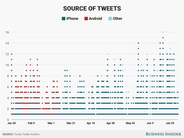 V prvních týdnech po Trumpově inauguraci byla většina tweetů na jeho účet odesílána z chytrého telefonu fungujícího na operačním systému Android. Už na začátku března ale začal převažovat iPhone, který nyní dominuje.