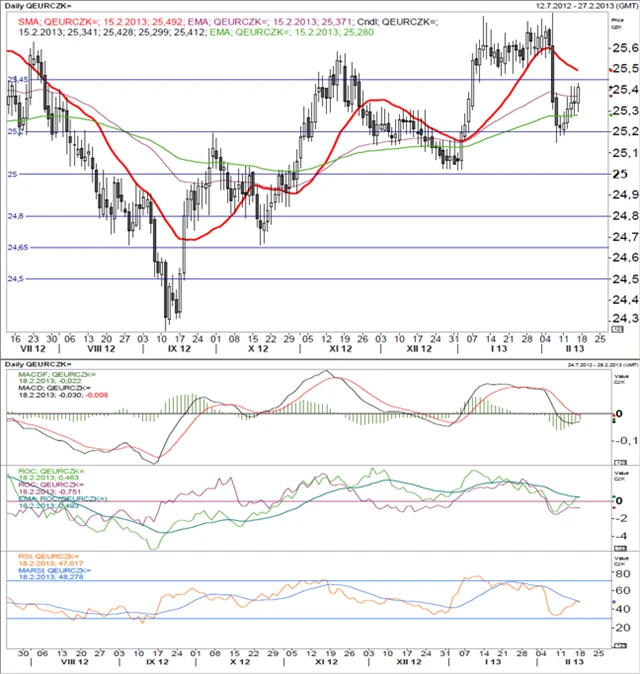 Korekci by měla zastavit hladina 25,45 nebo 20denní klouzavý průměr. Momentum je téměř neutrální, takže je nejpravděpodobnějším technickým scénářem konsolidace pod hladinou 25,45. Koruna se odrazila od hladiny 25,20 EUR/CZK, MACD otáčí směrem nahoru a je pod nulou. ROC20 i ROC50 otáčejí vzhůru, ROC20 po nulou, ROC50 roste nad nulu. RSI posílilo na neutrální úroveň.