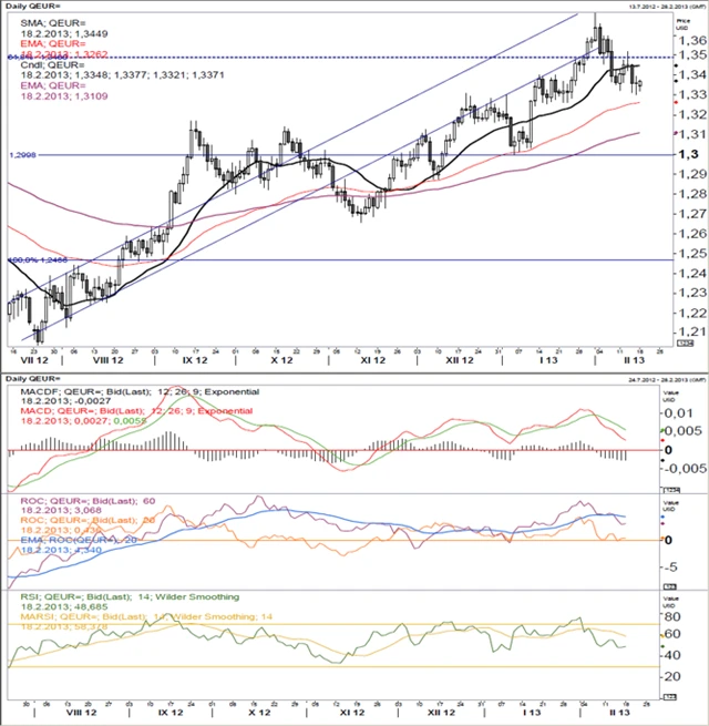 Konsolidace v pásmu 1,3270 (60denní klouzavý průměr) až 1,3488 by měla nějaký čas pokračovat. Stále převládá momentum směrem k růstu, ale slábne, takže časem bude sílit možnost tlaku na pokles. MACD je v klesajícím trendu nad nulou. ROC20 i ROC50 klesají, ROC20 testuje neutrální úroveň. RSI klesá poblíž neutrální úrovni.