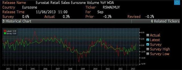 Eurozóna: Maloobchodní tržby za září meziročně +0,3 % (odhad: +0,6 %, předchozí: -0,3 %, revize: -0,2 %), meziměsíčně -0,6 % (odhad: -0,4 %, předchozí: +0,7 %, revize: +0,5 %)