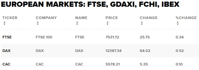 Regionální index STOXX Europe 600 zpevnil o 0,23 % na 387,75 bodu, britský FTSE 100 si připsal 0,34 % na 7 531,72 bodu, francouzský CAC 40 vzrostl o 0,1 % na 5 578,21 bodu a německý DAX získal 0,52 % na 12 387,34 bodu.