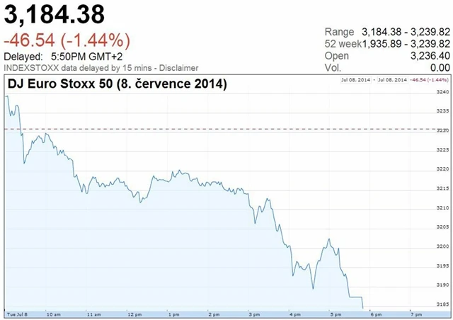 Britský FTSE 100 klesl o 1,25 %, německý DAX odepsal 1,35 % a francouzský CAC 40 oslabil o 1,44 %. Jednotný evropský index DJ Euro Stoxx uzavřel se ztrátou 1,44 % na 3 184,38 bodu. V červených číslech uzavřely všechny hlavní sektory indexu STOXX Europe 600, nejvíce ztrácely akcie ze stavebního odvětví, bankovní tituly a cenné papíry ze sektoru dopravy a cestovního ruchu.