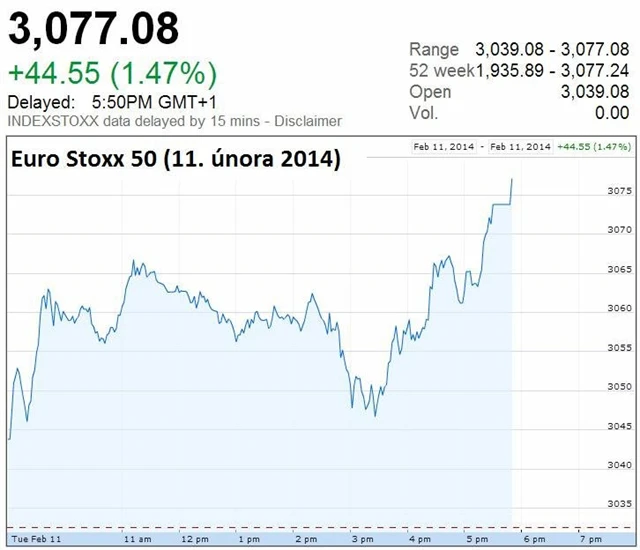 Jednotný evropský index Euro Stoxx 50 v úterý zahajoval v plusu a v zelených číslech setrvával celý den. Investoři během dne vyčkávali projev nové šéfky americké centrální banky Janet Yellenové na půdě amerického Kongresu.
