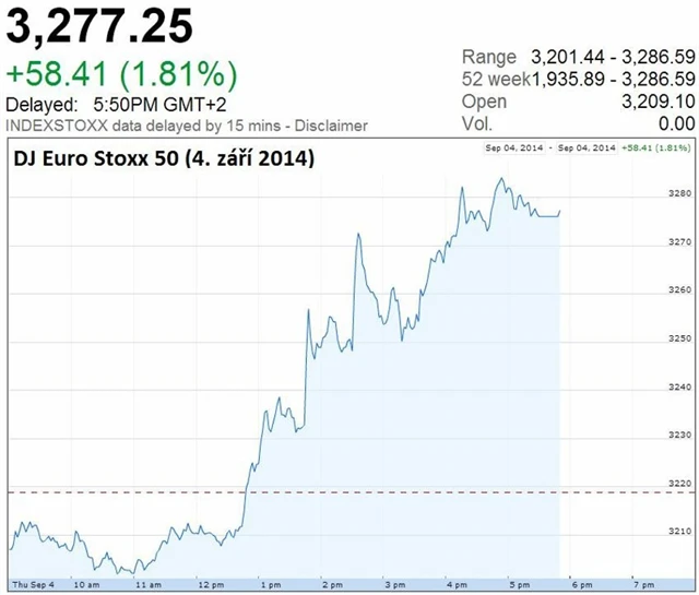 Široký západoevropský index FTSEurofirst 300 se vyhoupl dokonce na maximum za šest a půl roku, tedy od počátku minulé ekonomické recese. Posílil o 1,12 % na 1 401 bodů. Od poloviny letošního srpna, kdy začali investoři počítat s dalšími zásahy ECB proti deflaci a na podporu ekonomiky, už index získal zhruba osm procent.