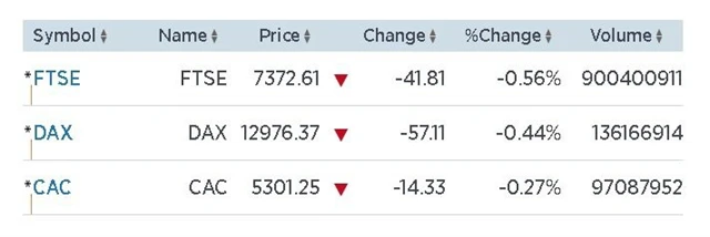 V závěru seance se indexům podařilo umazat část ztrát, do plusu se už ale dostat nedokázaly. Celoevropský akciový index STOXX Europe 600 klesl o 0,49 %, během dne ale ztrácel i více než jedno procento. Britský index FTSE 100 odepsal 0,56 %, německý DAX klesl o 0,44 % a francouzský CAC 40 si nakonec pohoršil o 0,27 %.